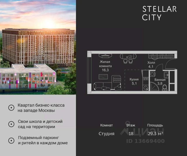 Продается квартира от надежного застройщика Tashir Estate в квартале бизнес-класса Stellar City в ЗАО Москвы. Площадь квартиры составляет: 28.7 кв. м, потолки: 3.1 м Квартира находится на 8 этаже, 4 корпуса жилого квартала Stellar City — микрогорода будущего на орбите Москвы. Stellar City — квартал в ЗАО Москвы вблизи инновационного центра Сколково. В окружении — 11 парков и природных зон, в том числе Долина реки Сетунь, Мещерский лес и парк развлечений The Rink. Город в городе Чтобы дом и инфраструктура вокруг отвечала динамичному лайфстайлу жителя мегаполиса, в основу проекта легла концепция город в городе, которая позволяет решать все бытовые вопросы in-home. В квартале будут возведены школа и детский сад, воркаут-зоны, променад, вело и беговые дорожки, детские площадки для каждого корпуса, а также коммерция на первых этажах для ежедневных покупок. Все необходимое — на расстоянии нескольких шагов. Изящные и лаконичные лобби Авторский дизайн, натуральные материалы в отделке и безупречный интерьер вне времени. Лобби и холлы в проекте бизнес-класса Stellar City ничем не отличаются от входных групп в премиум-сегменте благодаря качественным европейским материалам в отделке, стильному дизайну, консьерж-сервису и уютной зоне ожидания с журнальными столиками и мягкой мебелью. Комфорт и безопасность Закрытая территория, охрана, система СКУД, специально разработанное мобильное приложение дома для резидентов и подземный паркинг с круглосуточным наблюдением и доступом с помощью автоматического считывания номера авто. Продам квартиру-студию в ЖК Stellar City в Москве.