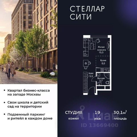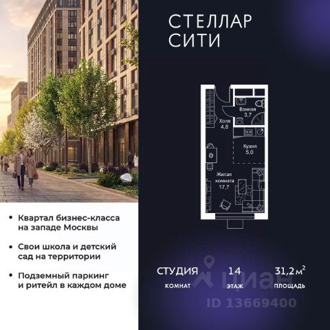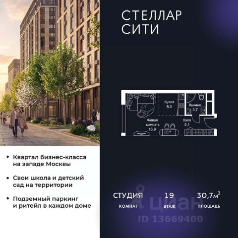 Продается квартира от надежного застройщика Tashir Estate в квартале бизнес-класса Stellar City в ЗАО Москвы. Площадь квартиры составляет: 30.8 кв. м, потолки: 3.1 м Квартира находится на 9 этаже, 4 корпуса жилого квартала Stellar City — микрогорода будущего на орбите Москвы. Stellar City — квартал в ЗАО Москвы вблизи инновационного центра Сколково. В окружении — 11 парков и природных зон, в том числе Долина реки Сетунь, Мещерский лес и парк развлечений The Rink. Город в городе Чтобы дом и инфраструктура вокруг отвечала динамичному лайфстайлу жителя мегаполиса, в основу проекта легла концепция город в городе, которая позволяет решать все бытовые вопросы in-home. В квартале будут возведены школа и детский сад, воркаут-зоны, променад, вело и беговые дорожки, детские площадки для каждого корпуса, а также коммерция на первых этажах для ежедневных покупок. Все необходимое — на расстоянии нескольких шагов. Изящные и лаконичные лобби Авторский дизайн, натуральные материалы в отделке и безупречный интерьер вне времени. Лобби и холлы в проекте бизнес-класса Stellar City ничем не отличаются от входных групп в премиум-сегменте благодаря качественным европейским материалам в отделке, стильному дизайну, консьерж-сервису и уютной зоне ожидания с журнальными столиками и мягкой мебелью. Комфорт и безопасность Закрытая территория, охрана, система СКУД, специально разработанное мобильное приложение дома для резидентов и подземный паркинг с круглосуточным наблюдением и доступом с помощью автоматического считывания номера авто.