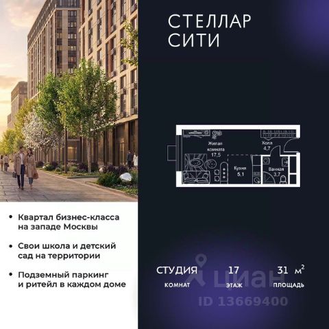 Продается квартира от надежного застройщика Tashir Estate в квартале бизнес-класса Stellar City в ЗАО Москвы. Площадь квартиры составляет: 30.8 кв. м, потолки: 3.1 м Квартира находится на 5 этаже, 4 корпуса жилого квартала Stellar City — микрогорода будущего на орбите Москвы. Stellar City — квартал в ЗАО Москвы вблизи инновационного центра Сколково. В окружении — 11 парков и природных зон, в том числе Долина реки Сетунь, Мещерский лес и парк развлечений The Rink. Город в городе Чтобы дом и инфраструктура вокруг отвечала динамичному лайфстайлу жителя мегаполиса, в основу проекта легла концепция город в городе, которая позволяет решать все бытовые вопросы in-home. В квартале будут возведены школа и детский сад, воркаут-зоны, променад, вело и беговые дорожки, детские площадки для каждого корпуса, а также коммерция на первых этажах для ежедневных покупок. Все необходимое — на расстоянии нескольких шагов. Изящные и лаконичные лобби Авторский дизайн, натуральные материалы в отделке и безупречный интерьер вне времени. Лобби и холлы в проекте бизнес-класса Stellar City ничем не отличаются от входных групп в премиум-сегменте благодаря качественным европейским материалам в отделке, стильному дизайну, консьерж-сервису и уютной зоне ожидания с журнальными столиками и мягкой мебелью. Комфорт и безопасность Закрытая территория, охрана, система СКУД, специально разработанное мобильное приложение дома для резидентов и подземный паркинг с круглосуточным наблюдением и доступом с помощью автоматического считывания номера авто.