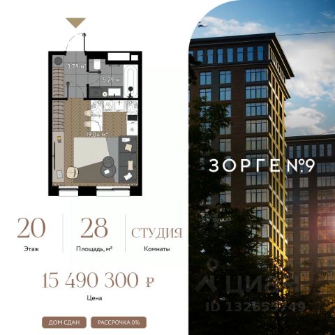 "Зорге 9" — готовый квартал апартаментов с премиальными сервисами на Ходынке. В трех корпусах с панорамными окнами предусмотрены уникальные форматы площадей, удовлетворяющие самый взыскательный вкус. В 7 минутах ходьбы от "Зорге 9" расположены 4 станции метро: Полежаевская", "Хорошевская", "Зорге" и "Хорошево". До делового центра "Москва-Сити" 10 минут на автомобиле. Простота форм, строгие линии, панорамные окна, архитектурное освещение и арт-объекты поддержат атмосферу роскоши и комфортной жизни на Ходынке. Именно за яркую архитектуру апарт-комплекс "Зорге 9" получил престижную международную премию European Property Awards. Комплекс полностью введен в эксплуатацию. "Зорге 9" — территория инноваций. Высокие потолки и панорамные окна Guardian ClimaGuard Solar с энергоэффективным "умным" напылением. Предусмотрен ряд премиальных сервисов: вход по Face ID, мобильное приложение резидента, дающее доступ ко всем услугам в один клик, 500 видеокамер на территории, двухуровневый подземный паркинг с автоматическим шлагбаумом, зарядкой для электромобилей, велосейфом и станцией подкачки шин. В "Зорге 9" можно рассмотреть варианты площадей от 27 до 81 кв. м, свободной планировки, с окнами в пол и высотой потолков 3,15 м, а также уникальные форматы пространств. Апартаменты с террасами позволят создать дополнительное рабочее пространство или зону отдыха на свежем воздухе, а тканевые маркизы помогут создать тень и повысить уровень приватности. Угловое остекление станет особой изюминкой и украсит любой интерьер. На последних этажах предусмотрены пентхаусы с каминами и выходами на кровлю: от 150 кв. м жилья high-уровня с максимальным уровнем инсоляции — на потолках в пентхаусах появятся так называемые "световые фонари". "Зорге 9" СДАН, все корпуса введены в эксплуатацию. Продается квартира-студия в ЖК Зорге 9 в Москве.