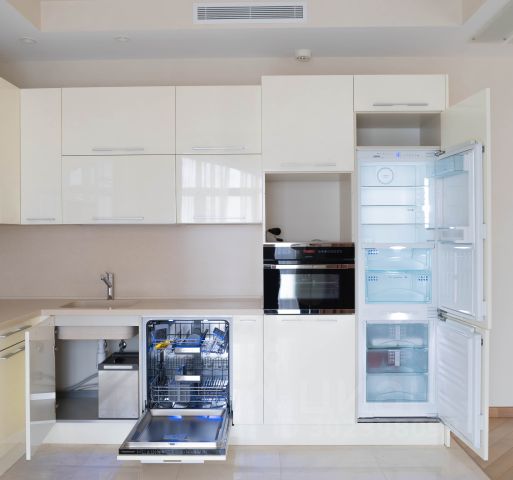 В кухне встроенная Итальянская мебель: варочная панель, духовой шкаф , посудомоечная машина и встроенный холодильник-Kuppersbusch.Столешница камень. Встроенные шкафы для хранения из натурального дерева .