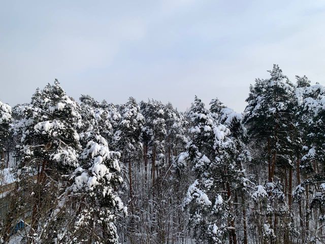 Высокие потолки и большие панорамные окна на разные стороны с видом на лес.