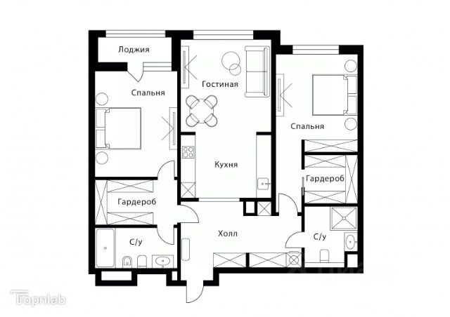 Очень удачная планировка: спальни разнесены по разным сторонам, кухня-гостиная в середине, много пространства, просторно. В свою очередь, помещение кухни-гостиной аккуратно зонировано: отдельно представлена рекреационная часть и отдельно обозначена зона кухни.