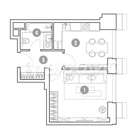 Кухня — 10 м² с выходом на лоджию 3 м² (панорамное остекление).