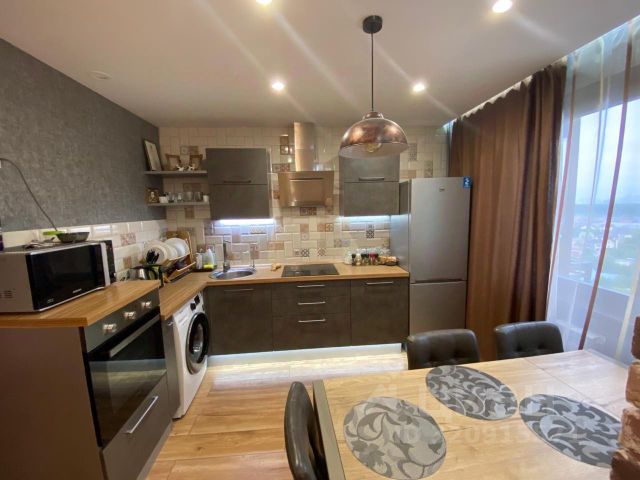 Квартира общей площадью 77.3 м2 имеет функциональное планировочное решение: зона кухни гостиной 27.1 м2, две изолированные спальни 18 и 17.3 м2, 2 сан.узла, зона для гардероба, просторная прихожая.