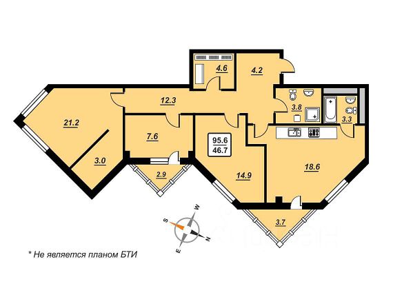 Планировка евро-трешка: проходная кухня-гостиная (26 кв.м.) + 2 изолированные комнаты с балконами (11+3,5; 11+3,5 кв.м.). Общая площадь 80 кв.м.