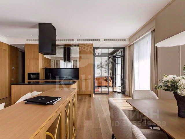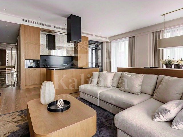 Квартира оборудована системой "умный дом" — BUS77 с управлением светом по протоколу Dali и моющим пылесосом Dreame Bot с подключением к водопроводу и системе канализации. Функциональная планировка включает кухню-гостиную, мастер-спальню с собственной ванной комнатой и гардеробной, две спальни, кабинет, санузел, две гардеробные, постирочную и холл. Из панорамных окон открываются виды на комплекс "Триумф-Палас" и благоустроенный двор.