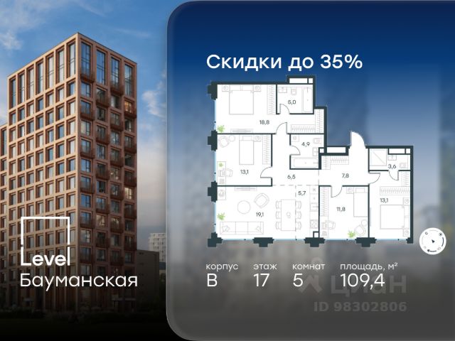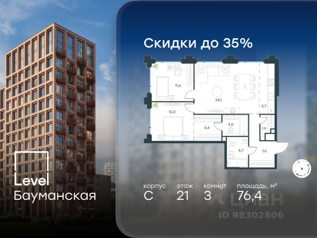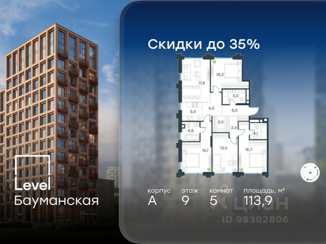 Цена указана с учётом скидки при 100%-й оплате, несубсидированной ипотеке, рассрочке (кроме программы "Рассрочка 0%"). В Басманном районе (ЦАО) продается 2-комнатная квартира площадью 40.20 кв.м без отделки. Квартира расположена на 9 этаже 9-этажного корпуса " A" в жилом комплексе бизнес-класса Level Бауманская (компания Level Group). Отличная транспортная доступность: - 15 мин. пешком до метро "Бауманская" и "Электрозаводская"; - 4 мин. на авто до ТТК; - 8 мин. на авто до Садового кольца; - 15 мин. на авто до Кремля. Продуманный архитектурный проект: - Архитектура от бюро ARCH(E)TYPE, вдохновленная историей района; - 95% квартир с панорамными видами на набережные, парки и сталинские высотки; - Высокие потолки от 3,02 м до 6,3 м; - Лобби с комфортными лаунж-зонами; - Благоустроенный закрытый двор без машин. Расположение и инфраструктура: Level Бауманская расположен в престижном Басманном районе (ЦАО). В пешей доступности находится легендарный МГТУ им. Баумана, Британский и Ломоносовский лицеи, а за 10 минут на автомобиле можно доехать до НИУ ВШЭ и других престижных вузов. На территории проекта предусмотрена развитая внутренняя инфраструктура: собственный детский сад и 10 коммерческих помещений на первых этажах домов. Благоустройство: Концепция благоустройства создана в соавторстве с именитым бюро GAFA. На площади 0,35 га расположатся зоны для отдыха, занятий спортом и прогулок. Во дворе для жителей жилого комплекса будет создан коворкинг прямо на свежем воздухе - открытые беседки и Wi-Fi на территории. Атмосферу приватности подчеркнёт обилие растительности - деревья и кустарники займут 50% двора. За счёт большого количества хвойных насаждений территория жилого комплекса будет зелёной круглый год. Инженерия и комфорт: Жители Level Бауманская не зависят от сезонного отключения горячей воды. Для этого в проекте предусмотрены центральные водонагреватели, обеспечивающие комфорт круглый год. Для безопасности созданы следующие системы контроля доступа: круглосуточное видеонаблюдение всех общественных зон (лобби, двор, лифты, паркинг), вызывные панели у входов на закрытую территорию, видеодомофоны с возможностью управления через мобильное приложение, распознавание автомобильных номеров при въезде/выезде в/из паркинга. По заявке собственнику предоставляется возможность просмотра изображения отдельных видеокамер. Лифты: В жилом комплексе устанавливается лифтовое оборудование Sicher Elevator - одного из ведущих производителей с 20-летним опытом и 40 представительствами по всему миру. Кабины от Sicher Elevator отличаются тихим и плавным ходом, особой износостойкостью и современными технологическими и дизайнерскими решениями. Все лифты имеют прямой доступ в паркинг с жилых этажей. В домах также предусмотрен сервисный лифт. Грузоподъёмность лифтов от 450 до 1000 кг, скорость 1,6 м/с.