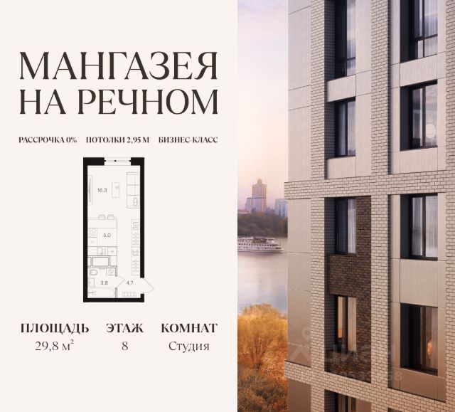 В продаже студия площадью 29.8 м2. Функциональная планировка, кухня-гостиная, просторные санузел и гардеробная. Квартира расположена на 8-м этаже 24-этажного дома. Стоимость указана с учетом скидки 10%, экономия составит 1 866 374 рублей! Стоимость квартиры без скидки 18 663 740 рублей. Условия покупки со скидкой 10%: - 100% оплата - Базовая ипотека Условия покупки без скидки: - Семейная ипотека от 3,5% на весь срок - Ипотека 0,11% на первый год - Рассрочка без процентов - Trade-in с проживанием на время строительства дома "Мангазея на Речном" расположена рядом с набережной, парками и территорией Северного речного вокзала. Первая очередь проекта два дома 12 и 24 этажа с приватным двором, ландшафтным благоустройством и инфраструктурой только для резидентов: кинозал, коворкинг, переговорные, зоны отдыха и комнаты для занятия фитнесом. Инфраструктура: - Школа на 1000 мест и детский сад - Дом Wellness со СПА-центром, фитнесом и массажными кабинетами и два бассейна, один из них под открытым небом - Два бассейна, один из них под открытым небом - Прогулочная набережная протяженностью 3,2 км с террасами - Зона воркаута и детские площадки - Ретейл, кафе, рестораны и бутики на первых этажах - Причалы для остановки яхт и небольших катеров Транспортная доступность: - 10 минут пешком до м. Речной вокзал - 15 минут пешком до м. Беломорская - 15 минут на машине до Белорусского вокзала - 17 минут на машине до Садового Кольца В первых корпусах "Мангазеи на Речном" представлены квартиры бизнес-класса с мастер-спальнями, террасами и видами на парк. Эксклюзивные форматы лоты с увеличенной высотой потолков и собственными выходом на благоустроенную территорию.