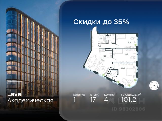 Цена указана с учётом скидки при 100%-й оплате, несубсидированной ипотеке, рассрочке (кроме программы "Рассрочка 0%"). В Академическом районе продаётся 2-комнатная квартира площадью 63.70 кв.м без отделки. Квартира расположена на 18-м этаже 19-этажного жилого комплекса бизнес-класса Level Академическая (компания Level Group). Площади помещений определены кадастровым инженером по результатам обмеров. Отличная транспортная доступность: - 1 мин. пешком до станции метро "Академическая"; - 4 мин. на автомобиле до ТТК; - 8 мин. на автомобиле до Садового кольца; - 13 мин. на автомобиле до Кремля. Продуманный архитектурный проект: - современная архитектура от бюро UNK project; - высокие потолки в квартирах до 6,62 м; - окна в пол высотой 2,5-2,68 м с панорамным видом на МГУ, Москва-Сити и другие доминанты Москвы; - квартиры с моллированным остеклением - радиусные окна открывают увеличенный угол обзора; - более 20 вариантов планировочных решений; - уникальные квартиры с собственным патио и возможностью обустройства дровяного камина; - квартиры сдаются без отделки, что открывает свободу для создания интерьера по своему вкусу. Расположение: Камерный проект из 1 корпуса расположен тихом зеленом районе Москвы, в непосредственной близости к центру города. В округе построено 80 детских садов, 50 школ и 30 вузов, 7 из которых входят в топ100 вузов России: МГУ, МГИМО, РАНХиГС, МИСИС, РУДН, РЭУ им. Плеханова и РГУ нефти и газа им. Губкина. Этот район буквально утопает в зелени парков, начиная с уютного Академического в 6 минутах пешком и заканчивая одним из крупнейших в городе парком 50-летия Октября (12 минут на автомобиле). Общая площадь природных объектов в радиусе 2-6 км от дома - 476,5 га. Внутренняя инфраструктура: На территории Level Академическая откроется собственный торговый центр, а для отдыха жителей будут созданы общественные пространства: комфортное лобби с дизайнерской отделкой, окнами в пол и потолками высотой 4,5 м, а также две благоустроенные зоны - территория по периметру здания и пространство на стилобате. Во дворе на стилобате предусмотрены детская и спортивная площадки, коворкинг и лаунж-зона на открытом воздухе. Стилобат украсят скульптуры животных - жирафа, зайца и волка, которые станут ярким акцентом внутреннего двора Level Академическая, подчеркивая близость к музею Дарвина. Процент озеленения территории - 58%. Технологии и безопасность: Жителей Level Академическая не коснется ежегодное отключение горячей воды благодаря собственным центральным водонагревателям. Безопасность гарантирует круглосуточная охрана, безлимитный Wi-Fi, круглосуточное видеонаблюдение. Удобное перемещение внутри комплекса будут обеспечивать 5 лифтов с доступом в паркинг с жилых этажей.