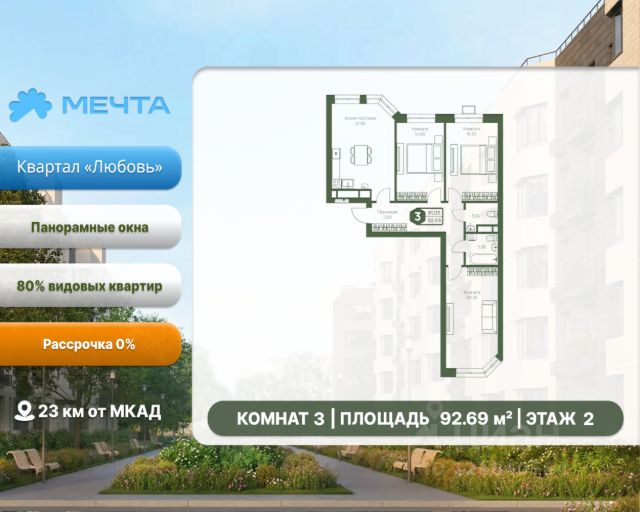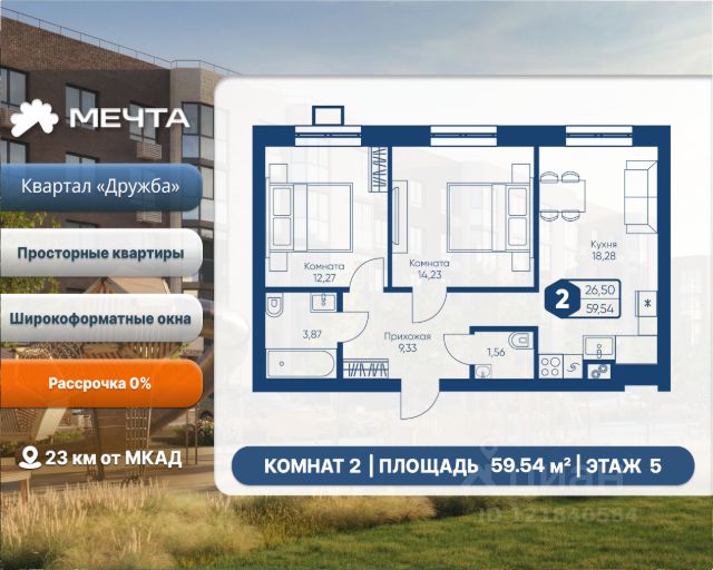Рассрочка 0% от застройщика! Продается двухкомнатная квартира в квартале "Дружба" жилого комплекса "Мечта". Общая площадь квартиры: 59.54 кв. м, этаж 5 из 5. Срок сдачи: 4 квартал 2027 г. Отделка: Чернова ОСОБЕННОСТИ: - Просторная кухня-гостиная - Продуманная планировка - Широкоформатные окна - 2 спальни - 2 санузла - Высота потолка: 2.7 метра Квартал "Дружба" состоит из пяти пятиэтажных домов с несколькими подъездами. Каждый дом оборудован широкими окнами, которые обеспечивают максимальный доступ естественного света и открывают прекрасный вид на окружающую природу. Квартал отличается большими застеклёнными лоджиями, которые позволяют наслаждаться свежим воздухом и красивым видом, не покидая своего жилища. Жилой комплекс "Мечта" расположен в 23 км от МКАД по Дмитровскому или Ленинградскому шоссе. ТРАНСПОРТНАЯ ДОСТУПНОСТЬ: - 15-20 минут на общественном транспорте до МЦД-1 "Лобня" - 30-35 минут на общественном транспорте до метро "Физтех" - 45-50 минут до станций метро "Савеловская" или "Белорусская" - 30 минут на автомобиле до Москвы Инфраструктура включает в себя муниципальную школу и детские сады, кабинет врача общей практики, множество кафе и ресторанов, а также различные спортивные и детские площадки. В пешей доступности от жилого комплекса расположены лес и три реликтовых озера — Долгое, Круглое и Нерское, а также реки Альба, Уча и Волгуша. Территория жилого комплекса закрыта для посторонних, находится под охраной и патрулируется. На въезде расположен КПП. Камеры видеонаблюдения работают круглосуточно на всей территории. Вы и ваши дети будете чувствовать себя в безопасности.