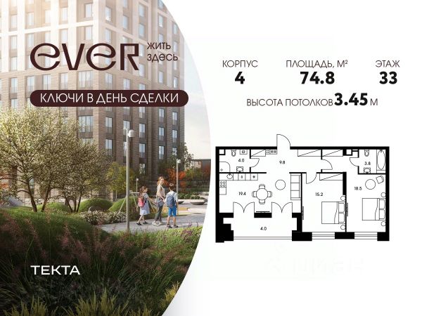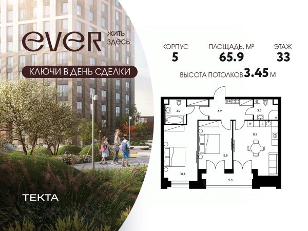 2-комн. квартира в ЖК "Ever" на 4 этаже в 34 этажном здании Корпус 5. Общая площадь: 55.4 кв.м., жилая: 29.5 кв.м. Высота потолков 3.00 м.