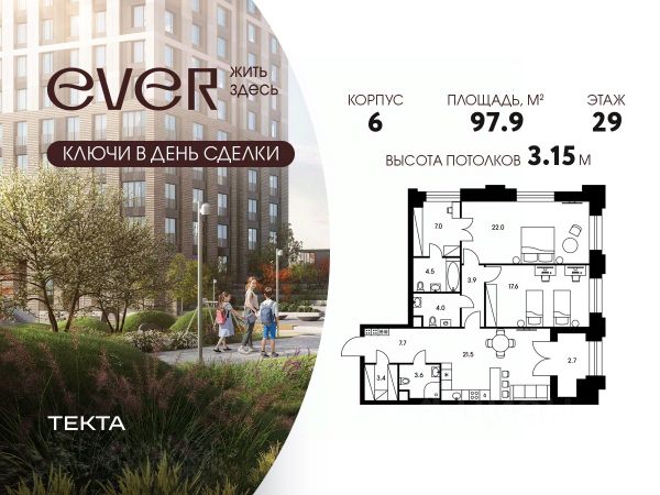 Жилой комплекс EVER — это гармоничное сочетание динамики мегаполиса и умиротворенности природы. Всего семь минут неспешной прогулки отделяют вас от станции метро ""Калужская"", обеспечивая быстрый доступ ко всем преимуществам жизни в Москве. Вернувшись домой, вы попадаете в атмосферу спокойствия и комфорта. Продуманная инфраструктура комплекса включает в себя не только уютные квартиры, но и удобный подземный паркинг, избавляющий вас от хлопот с поиском места для парковки, а также индивидуальные кладовые помещения, где можно хранить все необходимое.