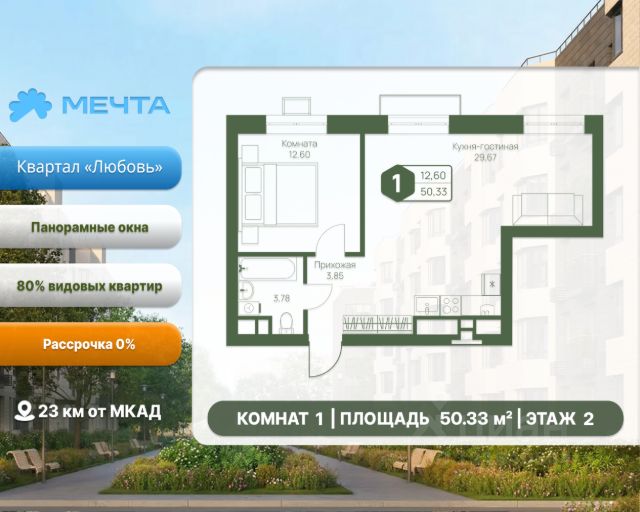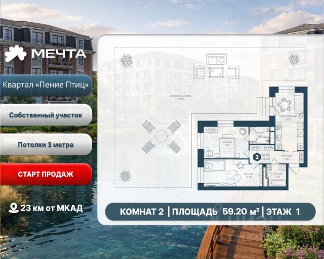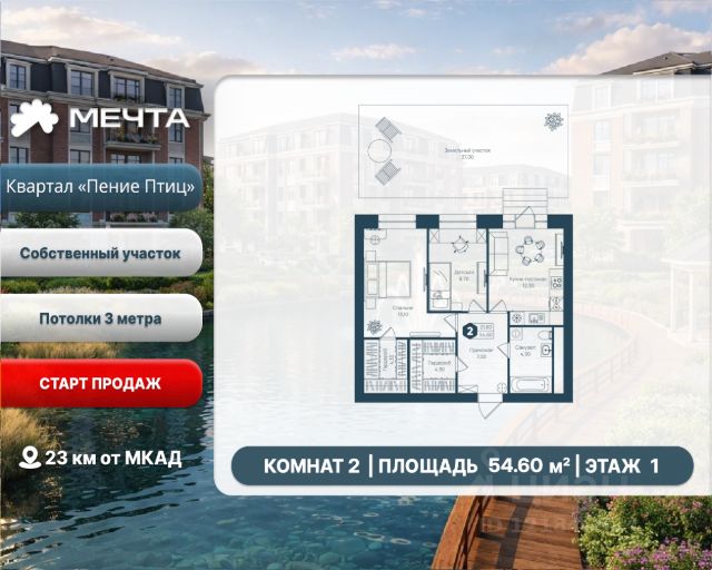 СТАРТ ПРОДАЖ! Рассрочка 0% от застройщика! Продается двухкомнатная квартира в квартале "Пение птиц" жилого комплекса "Мечта". Общая площадь квартиры: 54.60 кв. м, этаж 1 из 3. Срок сдачи: 4 квартал 2027 г. Отделка: Получистовая Квартал "Пение птиц" — это малоэтажный формат жизни у самого леса. Дома в 3 и 5 этажей с классическими фасадами и французскими балкончиками создают камерную атмосферу и ощущение загородного уюта. В пятиэтажных корпусах предусмотрены лифты. А прямо за окнами — природный заказник, так что лес становится естественным продолжением вашего дома. В квартале представлены квартиры с собственными земельными участками (до 3 соток) — редкий для малоэтажного формата вариант, позволяющий иметь личное пространство на природе. В самих квартирах продумано всё для простора и света: высота потолков 3 метра, панорамные окна и эркеры. Сердце квартала — современный пруд с собственной экосистемой. Летом здесь фонтан, мостики и шезлонги, а зимой пруд превращается в атмосферный каток. Это место для прогулок и отдыха, не выходя из района. Входные группы продуманы до мелочей: просторные холлы, колясочные, лапомойки. Всё создано для спокойной, комфортной и красивой жизни. Жилой комплекс "Мечта" расположен в 23 км от МКАД по Дмитровскому или Ленинградскому шоссе. ТРАНСПОРТНАЯ ДОСТУПНОСТЬ: - 15-20 минут на общественном транспорте до МЦД-1 "Лобня" - 30-35 минут на общественном транспорте до метро "Физтех" - 45-50 минут до станций метро "Савеловская" или "Белорусская" - 30 минут на автомобиле до Москвы Инфраструктура включает в себя муниципальную школу и детские сады, кабинет врача общей практики, множество кафе и ресторанов, а также различные спортивные и детские площадки. В пешей доступности от жилого комплекса расположены лес и три реликтовых озера — Долгое, Круглое и Нерское, а также реки Альба, Уча и Волгуша. Территория жилого комплекса закрыта для посторонних, находится под охраной и патрулируется. На въезде расположен КПП. Камеры видеонаблюдения работают круглосуточно на всей территории. Вы и ваши дети будете чувствовать себя в безопасности.