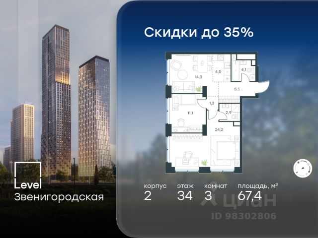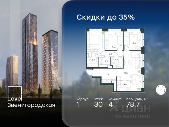 Цена указана с учётом скидки при 100%-й оплате, несубсидированной ипотеке, рассрочке (кроме программы "Рассрочка 0%"). В жилом квартале продаётся 2-комнатная квартира площадью 47.50 кв.м white box. Квартира расположена на 16 этаже 48 этажного корпуса 1 в жилом комплексе комфорт класса Level Звенигородская (компания Level Group/Левел групп). Отличная транспортная доступность - 5 мин. пешком до метро "Звенигородская" (откроется к окончанию строительства); - 18 мин. пешком до станции МЦК "Хорошёво" и станции БКЛ "Народное ополчение"; - 4 мин. на авто до ТТК; - 8 мин. на авто до Садового кольца; - 15 мин. на авто до Кремля. Продуманный архитектурный проект - Концепция от студии Станислава Михаловского, в основу которой легло единение природы и города; - Двухкамерные стеклопакеты в окнах, алюминиевый и ПВХ профиль - в квартирах тепло зимой и прохладно летом; - С верхних этажей откроются панорамные виды на город, Москву-реку, "Москва-Сити" и Москворецкий парк; - Лобби со всеми удобствами: окна в пол, высокие потолки до 4,7 м, лаунж-зоны, колясочные, гостевые санузлы и мойки для лап животных; - Централизованные водонагреватели гарантируют круглогодичную подачу горячей воды в каждую квартиру. Благоустройство Концепция благоустройства разработана совместно с бюро UNK landscape. Высота башен приближается к 200 метрам - они словно касаются неба. Небесный простор проецируется на территорию двора с помощью подсветки, визуально увеличивая пространство и отражаясь в авторских элементах архитектуры. На территории площадью 0,45 га расположатся: - "Облако событий" - место встреч и общения; - "Облако спорта" - всё для поддержания себя в форме; - "Облако принятия решений" - пространство для работы на свежем воздухе; - "Облако спокойствия" - для отдыха в тишине природы; - "Облако игр" - площадки для подростков и самых маленьких. Инфраструктура В жилом комплексе откроется 21 коммерческое помещение: продуктовые лавки, кафе, салоны красоты, службы доставки и творческие студии. Этап 1 включает строительство двухуровневого подземного паркинга. Всего здесь расположится 351 машино-место, включая семейные места, и 264 кладовых помещения. В распоряжении жителей развитая инфраструктура района: 15 супермаркетов, 5 спортивных объектов, 9 медучреждений, 7 детских садов, 4 школы, 3 благоустроенных парка - всё в шаговой доступности. Инженерия Комфортное перемещение внутри домов будут обеспечивать надёжные лифты с доступом в паркинг с жилых этажей. В каждом корпусе предусмотрено до шести кабин, включая сервисные лифты. Попасть на территорию комплекса можно только по единому ключу доступа. Видеонаблюдение установлено на входах в подъезды, в лобби, в общих зонах, на въезде в паркинг. Гости смогут связаться с жителями дома через входные видеопанели, а управлять доступом на территорию можно через видеодомофон или приложение на телефоне.