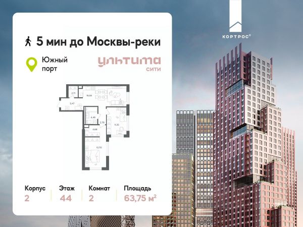 Предложение месяца от застройщика: - Скидка до 10% на ограниченный пул квартир - Рассрочка 0% на 1 год - Семейная ипотека без удорожания, ставка 4% - Ипотека для всех на весь срок, ставка 11,89% Продаётся 2-комнатная квартира от застройщика ГК "КОРТРОС" в жилом комплексе бизнес-класса УЛЬТИМА Сити. Квартира расположена на 15 этаже 52 этажного корпуса 2. Общая площадь 56,15 м². Без отделки. УЛЬТИМА Сити — жилой комплекс бизнес-класса в перспективном районе на юго-востоке Москвы. На его территории появятся 9 башен на 756 этажей, двухуровневый подземный паркинг, собственная инфраструктура, включая детский сад и школу. Всего девелопер благоустроит территорию в 2,6 га. Ближайшая станция метро — "Южный порт". Она откроется в 2028 году и будет находиться в 2-х минутах ходьбы. А прямо напротив расположится остановка водного автобуса-электрохода "Синичка". Дорога от квартала будет удобна и для автомобилистов: - до Кремля — 12 км - до МКАД — 12 км - до выезда на ТТК — 3 км - до Садового кольца — 8 км В двух корпусах первой очереди УЛЬТИМА Сити этажностью 45 и 52 реализуется 1 079 квартир с продуманными, рациональными планировочными решениями. В ассортиментной линейке представлены однокомнатные квартиры от 28,2 до 61 кв. м, двухкомнатные лоты от 44,3 до 95,4 кв. м, квартиры с тремя (71 — 115,57 кв. м) и четырьмя спальнями (106,6 — 114,97 кв. м). В экспозиции также есть квартиры с террасами, лоджиями, тремя и четырьмя санузлами, а также с функциональными нишами-кладовыми на кухнях. Запроектированы и эксклюзивные двухуровневые резиденции со вторым светом, в том числе с видом на Москву-реку, площадью от 77,7 до 141,9 кв. м. В рамках проекта запланировано строительство 9 корпусов, школы на 500 учащихся и детского сада на 225 мест. Еще будет создана продуманная инфраструктура для жителей: детские и спортивные площадки, амфитеатр для мероприятий, беседки и теплицы для садоводства, коворкинг, детский клуб и ресторан с открытой террасой. Доступ в жилой комплекс осуществляется по биометрическому контролю. Вокруг квартала будет приватная территория с видеонаблюдением и консьерж-сервисом 24/7. Лобби корпусов будут иметь двойные выходы: на улицу и во внутренний закрытый двор.