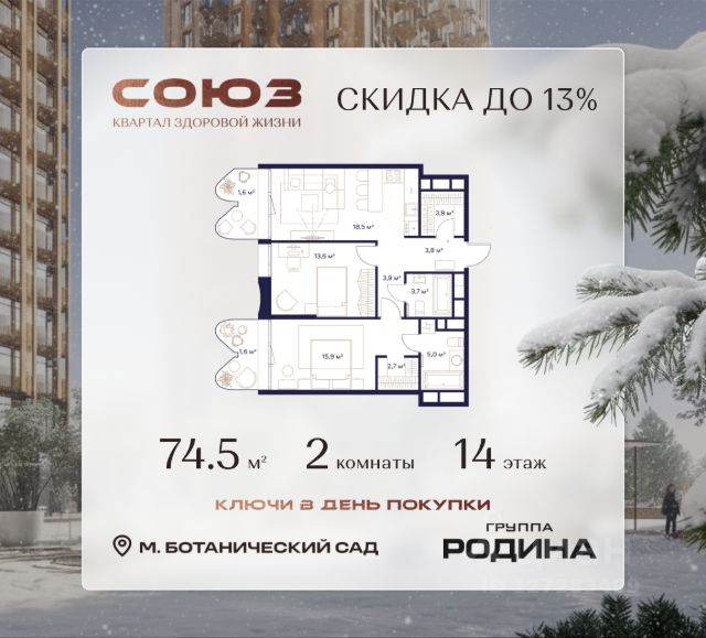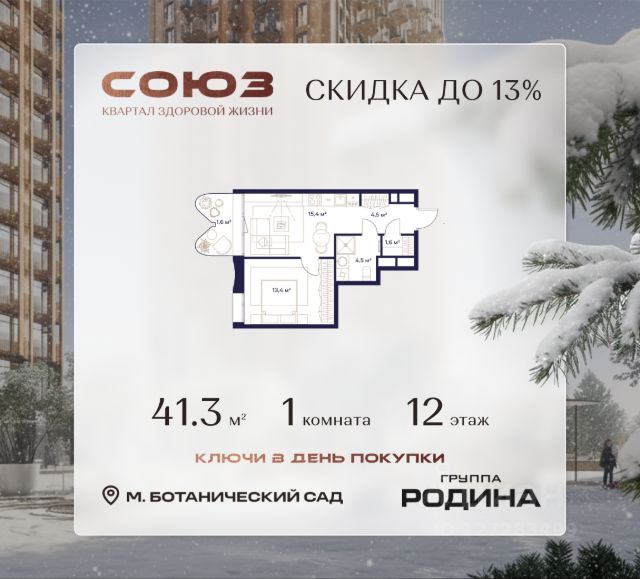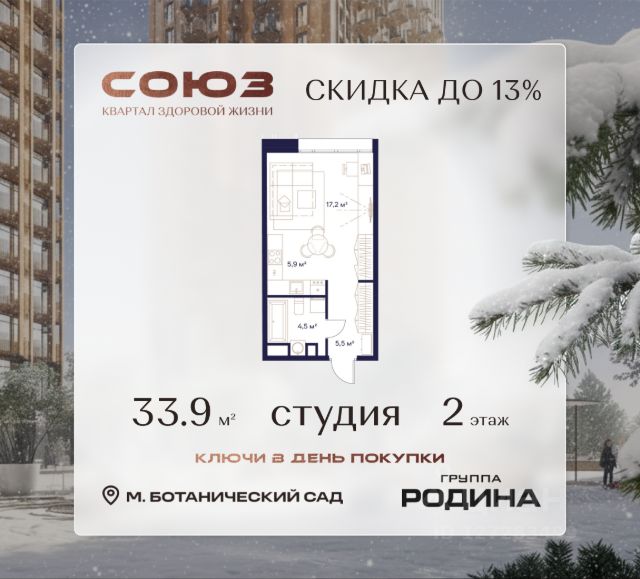 Готовые дома и ключи в день покупки Рассрочка 0% Продаётся 2-комнатная квартира площадью 61.4 м² на 2 этаже в Жилом Комплексе "Союз". Квартал здоровой жизни премиум-класса с рекордным количеством олимпийских видов спорта: - Ледовая арена для хоккея и фигурного катания, - Футбольные поля для тренировок, - Спортивный зал для фехтования, - Бассейн на 6 дорожек, - Центр единоборств, - 4 крытых площадки для настольного тенниса, - 7 теннисных кортов (крытых и открытых), - 4 крытых площадки для сквоша, - Легкоатлетический стадион, - Площадки для баскетбола и волейбола. Уникальные форматы квартир с мастер-спальнями, приватными террасами, балконами, а также пентхаусы с открыточными видами на город. Все квартиры продаются с отделкой Shell&Core и панорамным остеклением. Расположение Пешком: - 2 мин. до парка "Сад Будущего"; - 6 мин. до ст. м. "Ботанический сад"; - 6 мин. до ст. МЦК "Ботанический сад"; - 6 мин. до парка "Леоновская роща"; На автомобиле: - 2 мин. до СВХ (МСД); - 5 мин. до Проспекта Мира; - 10 мин. до ТТК; - 15 мин. до Садового кольца; - 25 мин. до аэропорта "Шереметьево". Благоустройство - собственная спортивная инфраструктура 7 Га; - зона для пикников; - игровые и спортивные площадки для детей всех возрастов; - розарий, а также сосновые, каштановые и дубовые аллеи; - площадки под открытым небом для занятий спортом и йоги; - игровые комнаты для детей; - лаунж-зона для резидентов; - просторная переговорная для деловых встреч; - премиальный ресторан "Шабада" Сосо Павлиашвили с водными арт-объектами на прогулочной аллее, садом ароматных трав и сценой под открытым небом; - кафе, химчистки, аптеки и супермаркеты рядом с домом. Окружение - 8 парков: Сад Будущего, Леоновская роща, Хуамин, Главный ботанический сад РАН, Шереметьевская дубрава, Останкино, парк спорта "Яуза", пойма реки Яуза и музей-усадьба "Останкино"; - 3 ВУЗа: ВГИК, РГСУ, МГПУ; - 12 школ, в том числе: школа 1499 им. И.А. Докукина (топ 100), Brookes Moscow, IThub школа; - 18 детских садов, в том числе билингвальный ALERTUM KIDS; - один из крупнейших океанариумов Европы "Москвариум"; - один из крупнейших в Европе торгово-развлекательных центров "Европолис".