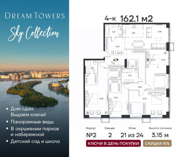 Рассрочка 0% от застройщика. Ключи в день покупки. ЖК Dream Towers проект премиум-класса в окружении парков и набережной, с полностью готовой инфраструктурой для комфортной жизни и отдыха. Продаётся 2-квартира на 17 этаже 24-этажного дома (2 корпус). Общая площадь: 58.1 кв.м. Высота потолков от 3.15 м. Город-курорт на 100 Га в шаге от вашего дома: - пляжный комлекс Dream Beach Club; - парк аттракционов Остров Мечты; - 44 Га ландшафтных парков; - пешеходная набережная; - яхт-клуб; - Южный речной вокзал; - вейк-парк и многое другое. В Dream Towers предусмотрено все для комфортной жизни с семьей: - дизайнерские лобби с общественной гостиной, колясочной и лапомойками; - охраняемый благоустроенной двор только для жителей; - собственный десткий сад и школа прямо во дворе; - красивая архитектура зданий в стиле Ар-деко; - облицовка фасадов из натурального камня с архитектурной подсветкой; - широкоформатное остекление окон в пол для лучших видовых характеристик на парки и пойму Москвы-реки; - подземный паркинг; - клубный формат проживания; - эргономичные планировки от 40 до 162 м2; - высокие потолки от 3,15 до 4,1 м; - квартиры с террасами; - вся необходимая инфраструктура на первых этажах домов, а также в торговой части тематического парка "Остров Мечты" (рестораны, кафе, супермаркет, магазины, салон красоты, йога-студия и многое другое). Центр рядом: 15 минут до Садового кольца на авто, 20 минут до Сити или Кремля. В 5 минутах прогулочным шагом — станция метро "Технопарк".