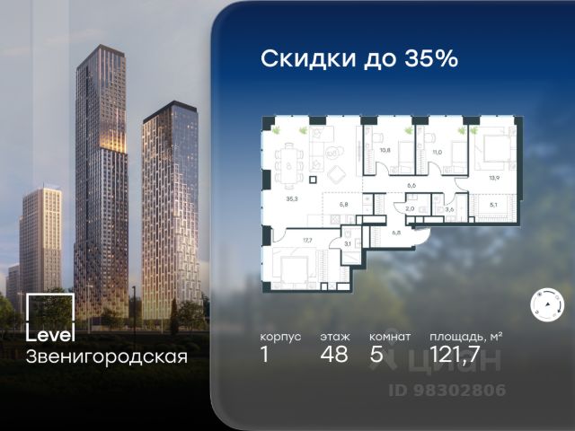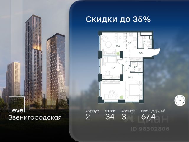 Цена указана с учётом скидки при 100%-й оплате, несубсидированной ипотеке, рассрочке (кроме программы "Рассрочка 0%"). В жилом квартале продаётся 1-комнатная квартира площадью 32.50 кв.м без отделки. Квартира расположена на 19 этаже 64 этажного корпуса 2 в жилом комплексе комфорт класса Level Звенигородская (компания Level Group/Левел групп). Отличная транспортная доступность - 5 мин. пешком до метро "Звенигородская" (откроется к окончанию строительства); - 18 мин. пешком до станции МЦК "Хорошёво" и станции БКЛ "Народное ополчение"; - 4 мин. на авто до ТТК; - 8 мин. на авто до Садового кольца; - 15 мин. на авто до Кремля. Продуманный архитектурный проект - Концепция от студии Станислава Михаловского, в основу которой легло единение природы и города; - Двухкамерные стеклопакеты в окнах, алюминиевый и ПВХ профиль - в квартирах тепло зимой и прохладно летом; - С верхних этажей откроются панорамные виды на город, Москву-реку, "Москва-Сити" и Москворецкий парк; - Лобби со всеми удобствами: окна в пол, высокие потолки до 4,7 м, лаунж-зоны, колясочные, гостевые санузлы и мойки для лап животных; - Централизованные водонагреватели гарантируют круглогодичную подачу горячей воды в каждую квартиру. Благоустройство Концепция благоустройства разработана совместно с бюро UNK landscape. Высота башен приближается к 200 метрам - они словно касаются неба. Небесный простор проецируется на территорию двора с помощью подсветки, визуально увеличивая пространство и отражаясь в авторских элементах архитектуры. На территории площадью 0,45 га расположатся: - "Облако событий" - место встреч и общения; - "Облако спорта" - всё для поддержания себя в форме; - "Облако принятия решений" - пространство для работы на свежем воздухе; - "Облако спокойствия" - для отдыха в тишине природы; - "Облако игр" - площадки для подростков и самых маленьких. Инфраструктура В жилом комплексе откроется 21 коммерческое помещение: продуктовые лавки, кафе, салоны красоты, службы доставки и творческие студии. Этап 1 включает строительство двухуровневого подземного паркинга. Всего здесь расположится 351 машино-место, включая семейные места, и 264 кладовых помещения. В распоряжении жителей развитая инфраструктура района: 15 супермаркетов, 5 спортивных объектов, 9 медучреждений, 7 детских садов, 4 школы, 3 благоустроенных парка - всё в шаговой доступности. Инженерия Комфортное перемещение внутри домов будут обеспечивать надёжные лифты с доступом в паркинг с жилых этажей. В каждом корпусе предусмотрено до шести кабин, включая сервисные лифты. Попасть на территорию комплекса можно только по единому ключу доступа. Видеонаблюдение установлено на входах в подъезды, в лобби, в общих зонах, на въезде в паркинг. Гости смогут связаться с жителями дома через входные видеопанели, а управлять доступом на территорию можно через видеодомофон или приложение на телефоне.