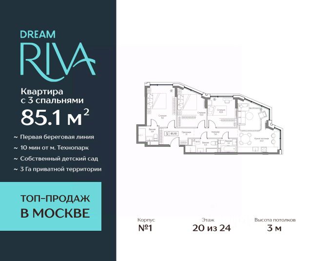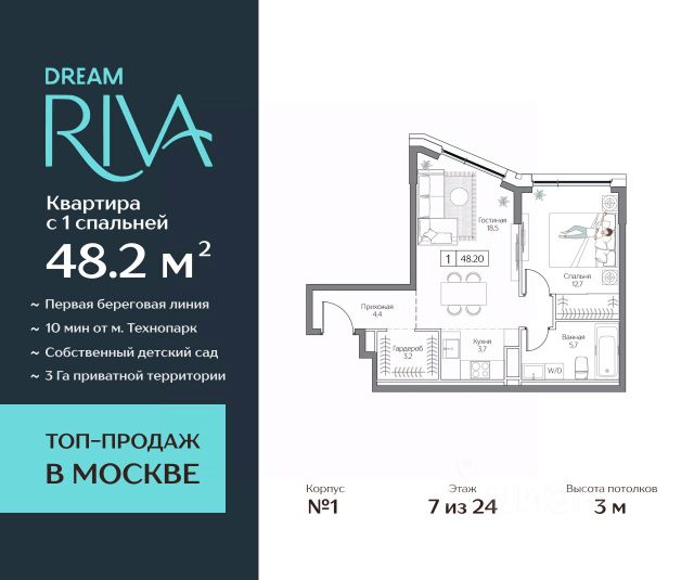 Увеличенный объем панорамного остекления создает неповторимое ощущения воздушности пространства! Двор-набережная с видами на гладь реки и кроны деревьев. Премиальный квартал DREAM RIVA — авторская архитектура в курортной концепции, воплощающей силу природных стихий в каждой детали оформления и благоустройства. Продаётся Квартира с 1 спальней квартира на 7 этаже 24-этажного дома (1 корпус). Общая площадь: 48.2 кв.м. Высота потолков от 3 м. Формат приватного досуга и эксклюзивные привилегии в DREAM RIVA с приоритетным доступом для резидентов: - Первая линия Москвы-реки с открытыми видами на воду и город; - 3 Га приватного прибрежного парка с зонами для спорта и йоги; - Открытый солярий; - Школа и собственный детский сад; - Многофункциональные детские игровые площадки и детское кафе с игровой комнатой; - Клубная гостиная и lounge-бар. Локация вне конкуренции — инфраструктура полуострова предлагает всё, что нужно для размеренной жизни, работы, отдыха и развлечений: - Благоустроенная набережная с гастрогалереей; - Парк аттракционов Остров Мечты (в торговой части: рестораны, кафе, супермаркет, магазины, салон красоты, йога-студия и многое другое); - 44 Га ландшафтных парков для прогулок, спорта, пикников; - Пляжный комплекс Dream Beach Club со множеством бассейнов, ресторанов, баров и развлечений для любого возраста; - Яхт-клуб; - Вейк-парк; - Кинотеатр под открытым небом и многое другое. Удобная транспортная доступность: - Центр рядом: 15 минут до Садового кольца на авто, 20 минут до Сити или Кремля; - В 5 минутах прогулочным шагом — станция метро "Технопарк"; - Южный речной вокзал. Наши менеджеры будут рады провести для Вас консультацию и подробнее рассказать о проекте. Успейте купить на лучших условиях!
