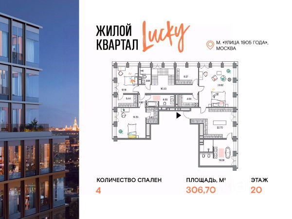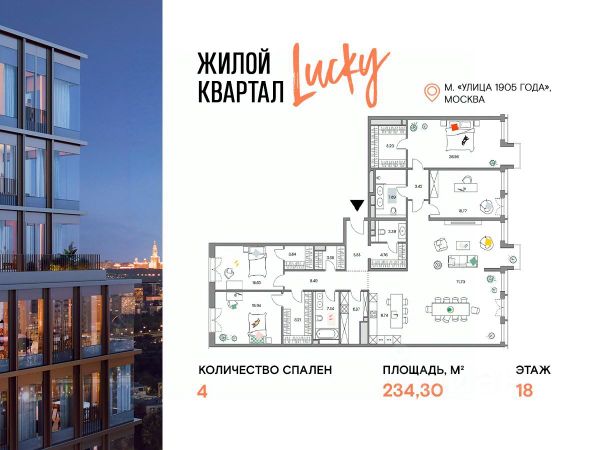 Продаётся 6 - комнатный пентхаус в готовом доме (Корпус 2), общей площадью 434.4 кв.м., на 21 этаже. О жилом комлексе Жилой квартал Lucky - это переосмысление и регенерация общественно-делового кластера площадью более 4.5 гектаров в центре Москвы. О застройщике Девелопер проекта Vesper специализируется в премиальном сегменте клубной жилой недвижимости. Портфель компании включает 22 проекта в Москве и странах Европы. Актуальные архитектурные проекты, индивидуальный дизайн, передовые технологии, качественные материалы и лучшие мировые практики воплощены в каждом доме компании. Расположение и транспортная доступность Квартал расположен на пересечении улиц 2-ая Звенигородская и Костикова, в 200 метрах от метро "Улица 1905 года". В непосредственной близости от парков, Москвы- реки, Сити и Садового кольца формируется идеальная среда для семейного проживания в мегаполисе. Архитектура Визуально квартал разделен на две части: верхний город с новыми высотными жилыми домами и нижний город с общественным пространством для инфраструктуры, где будет располагаться новый социокультурный кластер площадью около 10 000 кв. м. Верхний город будет состоять из восьми жилых домов: семь 21-этажных башен и одно здание высотой 15 этажей. В восьми новых домах расположены 618 квартир. На каждом этаже 3-4 квартиры, большая часть которых имеет ориентацию на 2-3 стороны света. Из панорамных окон открываются виды на набережную Москва-реки, Сити и близлежащие парки. Знаковая архитектура, продуманные планировочные решения, изысканная отделка, инновационные инженерные решения воплощены в квартале Lucky. Инфраструктура В квартале представлена инфраструктура для всей семьи: парки и скверы, билингвальный детский сад La Berezka, собственный 600 м. игровой парк для детей, фитнес с подогреваемым бассейном на крыше, рестораны, кафе и магазины органических продуктов. В шаговой доступности от квартала расположены лучшие рейтинговые школы.