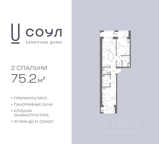 Цены указаны с условием 100% оплаты и стандартной ипотеки. Прямая продажа от застройщика! Продается 2-к. квартира номер 747 общей площадью 75.2 кв.м. на 3-м этаже 8 этажного дома, корпус UNIQUE (премиум-класс). Без отделки. Проект бизнес-класса СОУЛ от девелопера FORMA. До метро Сокол 10 мин пешком. Архитектура от британского бюро SimpsonHaugh. Благоустройство дворов — Gillespies и GAFA. Территория состоит из культурного парка и приватных дворов. Озеленение в эстетике лесного оазиса. Насыщенное благоустройство: прогулочные тропинки, релакс-зоны, пряный и сенсорный сады, развивающие детские площадки и воркауты. В центре проекта объект культурного наследия — общественное пространство Изофабрика, построенная в 30-х годах по проекту архитектора Георгия Гольца. Здесь будут располагаться мастерские для взрослых и детей, выставочные залы, коворкинги, образовательный центр, рестораны и кафе. Квартиры с панорамными окнами, мастер-спальнями, гардеробными, классическими балконами и лоджиями, видовыми террасами. Высота потолков от 2,9 до 3,5 м. В проекте 2 детских сада на 100 и 200 малышей. Клубная гостиная, фитнес-рум, детская игровая комната, дизайнерские лобби, подземный паркинг и келлеры.