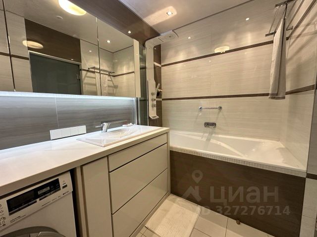 - В Ванной комнате: акриловая ванна, душевая система, гигиенический душ, смесители, стеклянная шторка на ванну, полотенцесушило, зеркало с подсветкой, тумба со встроенной раковиной, подвесной унитаз, дверки над коробом с инсталляцией, проточный обогреватель, стиральная машина,