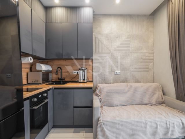 - Кухня от фабрики "Стильные кухни", индукционная плита, духовка, микроволновка, диспоузер Bone Crusher (измельчитель отходов внутри раковины), фильтр обратного осмоса — можно пить воду прямо из-под крана, посудомойка с автоматическим открыванием после завершения работы. Раздвижной дизайнерский стол на 4-6 человек.