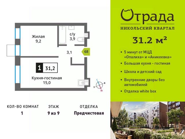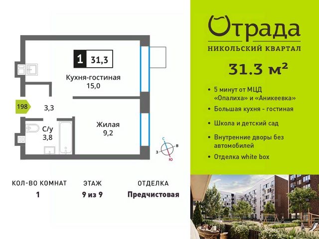 Вашему вниманию предлагается светлая уютная евро трех-комнатная квартира в современном ЖК ОТРАДА. Квартира площадью 50,6 кв. м с евро-ремонтом, Кухня-гостиная 17,6м. отдельные 2 спальни 11,2/10,6 кв.м., холл-прихожая 5м., совмещенный санузел 4,1м. Квартира расположена на 1 ом этаже с террасой 27 кв.м Летом и осенью вид очень красивый, возможность отдыхать и проводить время на открытом воздухе своей террасы. В квартире выполнен хороший качественный ремонт. Пространство квартиры позволит комфортно разместиться молодой паре или семье с ребенком. Функционал планировки грамотно простроен, а также много мест для хранения вещей, В квартире много солнечного и дневного света, установлен новый кондиционер, Квартира готова принять своих новых Хозяев. С нетерпением ждем Вас на показы в любое удобное для Вас время. Вечерние прогулки внутри двора в близи озера делают Ваш отдых приятным и полноценным, позволит Вам восстановится после рабочего дня, а закаты удивят Вас своей красотой. Клубный дом "Комфорт+" с закрытым двором и подземным паркингом, Жилой комплекс Отрада располагается на Пятницком шоссе, прямо за московским районом Митино, всего в 5 минутах от станций метро Пятницкое шоссе и Митино. В Отраде есть всё, что необходимо современному человеку. На территории и в шаговой доступности от комплекса находятся детские сады и школы, детские секции, магазины шаговой доступности (Вкусвилл, Пятерочка, Магнит, Буханка), аптеки, торговые центры, поликлиника и СПА-салоны, развлекательные центры и рестораны. Самый большой в Московской области конно-спортивный комплекс КСК "Отрада", прямой выход в лес (300га), 18 км. оборудованных пешеходных дорожек. В 10 мин. на велосипеде разлив реки Синичка с пляжной зоной и выход в Красногорский лес. На территории комплекса два муниципальных детских сада и 2 частных. В 2024 году открыла свои двери для детей современная муниципальная школа. Сделка через офис застройщика, поможем вам с оформлением ипотеки, полный пакет услуг. Два взрослых собственник, полная стоимость в договоре. Зарегистрированных лиц в квартире нет, мат кап не использовался, есть текущее обременение ПАО Сбербанк.
