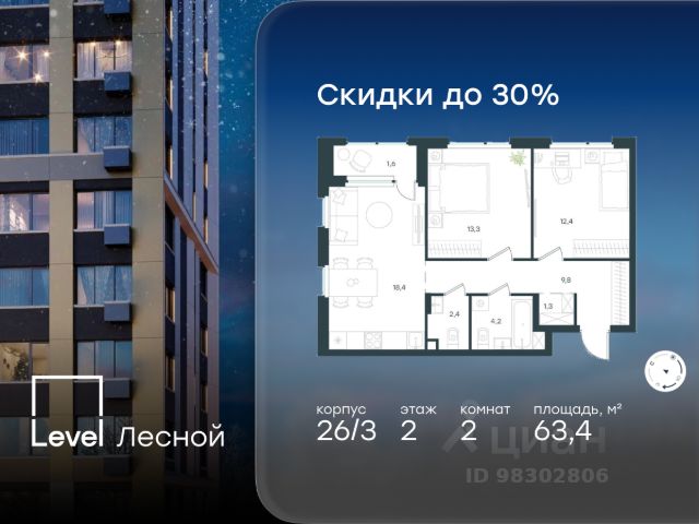 Цена указана с учётом скидки при 100%-й оплате, несубсидированной ипотеке, рассрочке (кроме программы "Рассрочка 0%"). В районе, утопающем в густой зелени лесов, многочисленных парков и скверов, продаётся 2-комнатная квартира площадью 61.80 кв.м с отделкой white box. Квартира расположена на 7 этаже в жилом комплексе комфорт-класса Левел Лесной (компания Level Group/Левел групп). Жилой квартал Левел Лесной расположен в посёлке Отрадное Красногорского района Московской области. Это уникальный природный уголок вблизи района Митино. Посёлок окружён обширными лесными массивами. Обилие зелени создаёт благоприятный экологический фон и превращает этот район в оазис спокойствия и единения с природой. Расположение и инфраструктура: - Район окружен роскошной зеленью лесов и парковых зон, занимающих территорию свыше 1 000 гектаров, среди них лесопарк внутри жилого комплекса, загородный парк "Отрада", Митинский лесопарк, набережная реки Синички. - Идеальные условия для активного отдыха в любое время года: пешие и велопрогулки, бег, зимой - лыжи и катание на ватрушках. - На территории ЖК - частная школа "Светлые Горы", входящая в топ лучших школ Москвы и Подмосковья (Forbes Education, 2023), и детский сад, в пешей доступности расположены 9 детских садов. - На территории жилого комплекса - сетевые супермаркеты, локальные магазины, аптеки, салоны красоты, рестораны и другие объекты инфраструктуры в сданных корпусах. В 12 мин. пешком - крупный торговый парк "Отрада" с гипермаркетами, кинотеатром и детскими развлечениями. Отличная транспортная доступность: - 25 мин. пешком до станции метро "Пятницкое шоссе"; - 28 мин. на автобусе до станции метро и МЦД-2 "Волоколамская"; - 11 мин. на авто до МКАД; - 25 мин. на авто до ТТК. Продуманный архитектурный проект: - Концепция проекта Левел Лесной разработана бюро СПИЧ; - Высотность комплекса до 15 этажей с уникальными видами на лесные массивы и город; - Высота потолков до 3 м; - Современные окна высотой до 1,6 м, в части квартир предусмотрены окна в пол. Высота подоконников 0,6 м. Благоустройство: Продуманное пространство и аура приватного европейского городка рождают чувство лёгкости и расслабления у каждого, кто попадает на территорию проекта. Концепцию общественных площадок разработали в партнёрстве два архитектурных бюро: Highlight Architecture и SCAPE. В безопасных дворах без машин каждый обязательно найдёт себе место для вдохновения, отдыха и спорта.