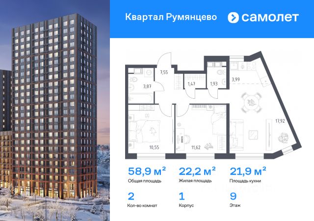 Строим кварталы для жизни с заботой о будущем. Предлагается 2-комнатная квартира комфорт-класса 47,92 кв.м в корпусе 2 на 21 этаже, в ЖК "Квартал Румянцево" Квартира с чистовой отделкой. Доступность дополнительных опций уточняйте у застройщика. Приобрести квартиру возможно по специальным акциям от застройщика, с текущими условиями акций можно ознакомиться в блоке "Акций". Цена динамическая и может отличаться, уточняйте актуальность у застройщика. "Квартал Румянцево" — современный проект в 2 км от МКАД, в экологически благоприятном районе Новой Москвы. Территория квартала утопает в зелени, а вся необходимая инфраструктура, включая учебно-воспитательный комплекс, — в шаговой доступности. Близость метро "Румянцево" и "Саларьево" делает проект отличным вариантом для тех, кому важно быстро добираться в любую точку города. До ближайших лесопарков — Тропаревского и Троицкого — можно прокатиться на велосипеде. Дорога займет всего 10 минут. Для детей построят учебно-воспитательный комплекс, в который войдут общеобразовательная школа, детский сад, а также кружки и секции. На первых этажах жилых домов откроются магазины и аптеки, пекарни и кафе. На территории жилого комплекса появится большой сад с многолетниками, аллеи для прогулок и зеленые прогулочные бульвары. А для велосипедистов спроектирована сеть велодорожек, по которым можно добраться до ближайших станций метро.