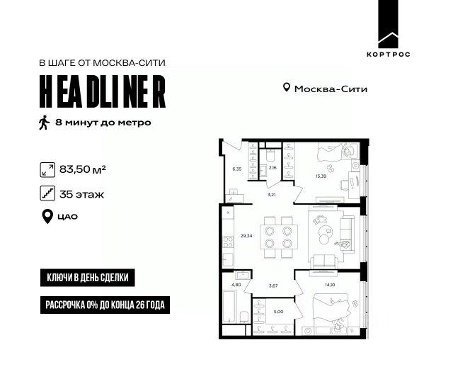 Продаётся 3-комнатная квартира для в ЖК HEADLINER, общей площадью 95,8 кв. м, на 2 этаже. Высота потолков 3 м. Это просторная, светлая квартира подойдет для большой семьи, в ней три полноценные спальни и кухня-гостиная. В квартире предусмотрено 2 санузла и 3 гардеробные комнаты. Окна в квартире выходят на разные стороны, также в квартире есть лоджия. В квартире выполнена предчистовая отделка White box. Дом сдан. Квартал HEADLINER находится в Пресненском районе ЦАО, рядом с м. "Шелепиха". В непосредственной близости Москва-Сити. Рядом находятся парк Причальный и Шелепихинская набережная. За 5-10 минут на автомобиле можно добраться до парков Фили, Красногвардейские пруды, Красная Пресня и парка Победы. В пешей досягаемости - ТРЦ "Афимолл Сити", ТРЦ "Филион", ТРЦ "Европейский", World Class, а также вся инфраструктура ММДЦ "Москва-Сити". На территории ЖК расположен филиал частной аккредитованной школы полного дня "Путь к успеху". В непосредственной близости расположены лучшие школы ЦАО: ГБОУ "Романовская школа", физико-математическая школа 56 им. академика В.А. Легасова, школа с углубленным изучением английского языка 1232 "На Кутузовском". Особенности ЖК: - Потрясающие видовые характеристики открываются на "Москва-Сити", Москву-реку и панораму центра столицы; - 8 минут пути до набережной Тараса Шевченко с живописными видами на Headliner и Деловой центр; - Разная высота корпусов: от 5 до 51 этажа с уникальным внешним видом; - Потолки от 3 м; - Доступны варианты как с отделкой white box, так и без нее; - 80% квартир имеют ширкоформатные окна; - Вместительный двухуровневый подземный паркинг с кладовыми; - Лаунж-зоны с каминами и стильной мебелью; - Колясочные и гостевые уборные; - Концепция "дворы без автомобилей"; - Консьерж-зоны в подъездах; - Видеонаблюдение, круглосуточная охрана.