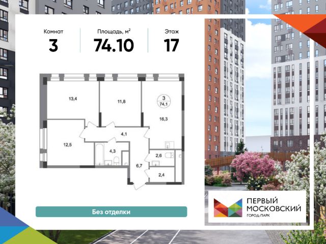 Продается трехкомнатная квартира без отделки в 9 фазе города-парка "Первый Московский". Общая площадь квартиры - 74,1 кв. м, этаж 11 из 19. Срок сдачи - 2 квартал 2027 года. Тип дома - монолитный. Цена указана при 100% оплате. Новый корпус состоит из 3 секций: Все квартиры с отделкой White Box с возможностью дополнительного выбора дизайнерской отделки: Classic или Smart+ Город-парк "Первый Московский" расположен всего в 7 км по Киевскому шоссе (Новая Москва). Из города-парка прямой выезд на Киевское шоссе и трассу Солнцево-Бутово-Варшавское шоссе. ТРАНСПОРТНАЯ ДОСТУПНОСТЬ: - 5 мин. на личном автомобиле или 10 мин. на автобусе 189, 147, 193 до станции метро "Филатов Луг" - 5 мин. на личном автомобиле или 12 мин. на автобусе 863 до станции метро "Саларьево" - 6 мин. на личном автомобиле или 15 мин. на автобусе 333 до станции метро "Рассказовка" РАЗВИТАЯ ИНФРАСТРУКТУРА В ОКРУЖЕНИИ: - общеобразовательная школа 2120 (корпуса д1, д7, ш1-ш5) - детский сад 2120 (корпуса д2, д9) - школа искусств - городская больница, детская поликлиника, филиал 5 - подстанция скорой помощи 58 и пожарно-спасательный центр 313 - отдел полиции, отдел ГИБДД - торговые центры "Столица" и "Новомосковский" - стадион, каток, бассейн - кафе, продуктовые магазины, аптеки, фитнес-центры, салоны красоты и пр. БЛАГОУСТРОЙСТВО: - дворы без машин - разнообразные детские площадки и развивающие комплексы - детские площадки разделены по возрастным группам - максимальная близость корпуса к парку "Филатов луг" - озеленение территории с учетом зонирования, островками для отдыха ОСОБЕННОСТИ АРХИТЕКТУРЫ: - безбарьерные входные группы - велопарковка на -1 этаже - колясочные в каждой входной группе - коммерческие помещения на 1 этаже в трех секциях - кладовые помещения расположены на жилых этажах и на -1 этаже - в каждой секции корпуса - 4 лифта: 2 пассажирских, 2 грузовых - видеонаблюдение установленное в холлах первых этажей, у подъездов и на прилегающей территории АВТОРСКИЙ ДИЗАЙН: Входные группы выполнены по авторскому дизайну, оснащены системой "тёплый пол". В каждой входной группе будет располагаться комфортабельная зона ожидания, почтовые ящики с ячейкой для спама, колясочная, акцентные пуфы и столик.