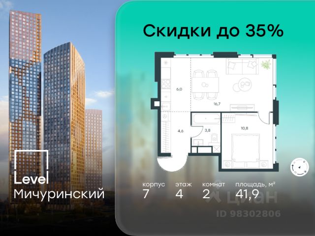 Цена указана с учётом скидки при 100%-й оплате, несубсидированной ипотеке, рассрочке (кроме программы "Рассрочка 0%"). В жилом квартале, расположенном на границе с природным заказником "Долина реки Очаковки", продаётся 2-комнатная квартира площадью 44.10 кв.м без отделки. Квартира расположена на 3 этаже 12-этажного корпуса 9 в жилом комплексе бизнес-класса Level Мичуринский (компания Level Group/Левел групп). Отличная транспортная доступность - 10 мин. пешком до станции метро "Мичуринский проспект" - 15 мин. пешком до станции метро "Аминьевская" - 7 мин. на авто до МКАД - 10 мин. на авто до ТТК - 15 мин. на авто до Москва-Сити Продуманный архитектурный проект - Выразительная архитектура от известных бюро: корпуса 1-6 - СПИЧ, корпуса 7-13 - Borisov Architects; - Из окон открываются живописные виды на парки, Москва-Сити и МГУ; - Высокие потолки до 6,35 м; - Стильные лобби с окнами в пол и высокими потолками до 4,7 м; - С каждого этажа дома на лифте можно спуститься в подземный отапливаемый паркинг. Расположение Level Мичуринский строится в одном из самых зеленых районов Москвы - Очаково-Матвеевское. Этот уголок столицы идеален для поддержания здорового образа жизни. В шаговой доступности от проекта находятся заказник "Долина реки Очаковки" - 1 мин. пешком и Очаковский парк - 7 мин. пешком. На велосипеде можно добраться до таких парков, как "Событие", парк Олимпийской деревни, парк 50-летия Октября и парк Школьников. В 15-минутной доступности на авто расположено более 30 детских садов (из них 14 в пешей доступности), 32 школы (из них 13 в пешей доступности) и 14 вузов. В ближайшем окружении работает более 25 медицинских учреждений, 11 спортивных клубов и 22 продуктовых супермаркета. Внутренняя инфраструктура На территории жилого комплекса строится три детских сада и школа. На первых этажах домов откроется супермаркет, фитнес-центр, ресторан, кафе и другие сервисы. Подземные этажи займут паркинги: трехуровневые в этапах 1 и 2, одноуровневый в этапах 3 и 4. Преимущества проекта - 4,5 га благоустроенной территории с видовым мостом, уличным кинотеатром, зонами для тихого отдыха, работы, воркаута, площадки для петанка, футбола, настольного тенниса и пляжного волейбола; - Дизайнерские лобби с панорамным видом на двор, мойками для лап животных и комфортными зонами ожидания. - Безопасность жителей: круглосуточное видеонаблюдение всех зон общего пользования (лобби, лифты, паркинги, детские площадки), система контроля доступа, управление видеодомофоном через мобильное приложение, единый ключ доступа на территорию жилого комплекса. - Технологии и комфорт: высокоскоростной Wi-Fi в лобби и на придомовой территории, автоматическая система контроля и учета ресурсов, абонентская связь с консьержем, распознавание номеров автомобилей при въезде/выезде в/из паркинга.