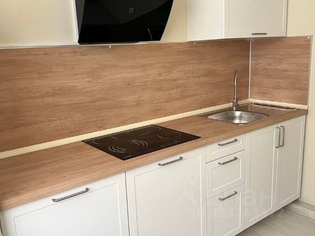 Большая 10-ти метровая кухня с полным комплектом бытовой техники (встроенные: большой холодильник, варочная панель, духовой шкаф, СВЧ-печь, посудомоечная и стиральная машины, вытяжка, подсветка, телевизор 32 диагонали), фартук выложен плиткой.
