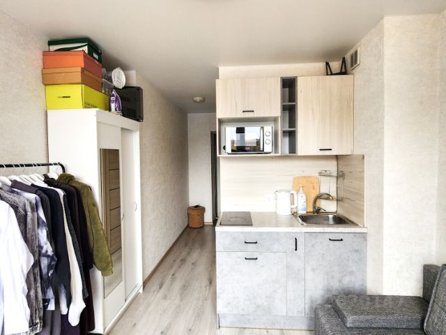 Апартамент в продаже с отделкой, кухней, укомплектованным санузлом. На фото пример отделочного решения, а также студия в текущем состоянии. Возможна хорошая скидка в случае, если Вы хотите сделать отделку сами.