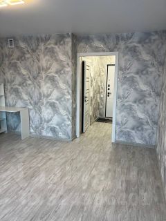 На стенах поклеены обои под покраску, на полу постелен ламинат с плинтусами и откосами. Есть вытяжная вентиляция в санузле и на кухне, выходы хв/гв, место под раковину на кухне. Кроме того, в помещениях уже есть выключатели освещения, розетки для бытовой техники и роутера, а также сделаны закладные для оптоволокна для интернета.