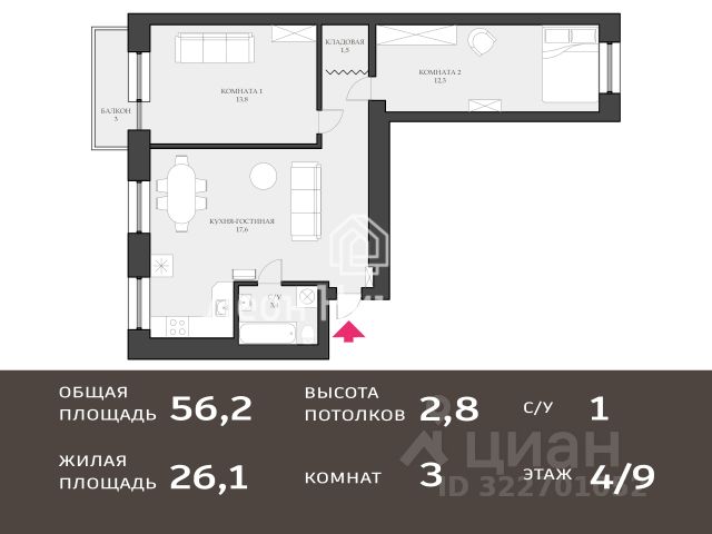 ID 300 834. Квартира вторичка рядом с метро Студенческая.