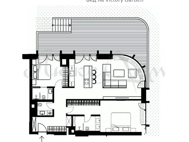 Планировочное решение: просторная кухня-гостиная, спальня, один с/у.