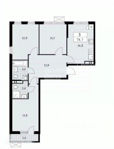 Жизнь у воды: просторная трехкомнатная квартира 74,7 м² (с учетом лоджии) с мастер-спальней в ЖК "Прокшино" — свободная планировка для вашего идеального дома