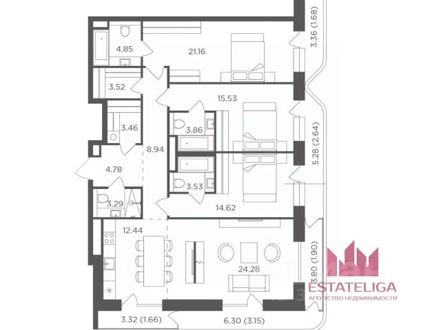 Квартира оснащена 2-мя совмещенными санузлами