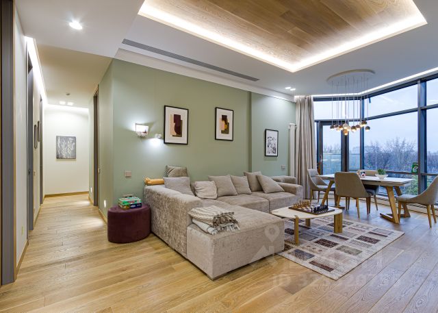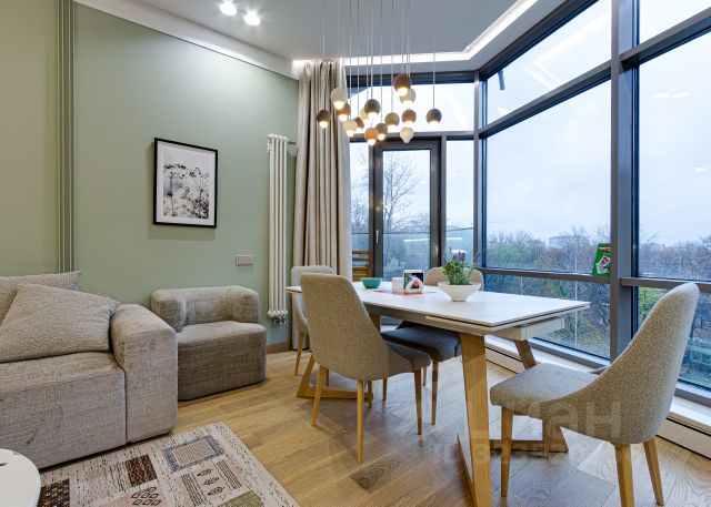ПЛАНИРОВКА. В квартире много света и солнца, так как впереди нет высотных зданий, открывается панорамный вид на город. Просторная гостиная с кухонной и обеденными зонами расположена вдоль окон, спальня размещена в алькове за двумя раздвижными трехметровыми дверьми, которые в закрытом виде изолируют ее полностью,а при открытых дверях в спальню попадает достаточно дневного света и воздуха. В квартире спроектированы два санузла гостевой и при спальне, а также несколько вместительных систем хранения в прихожей и коридоре.