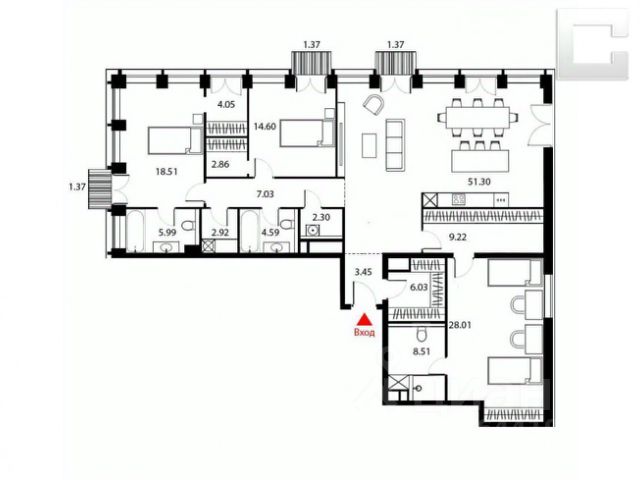 -увеличенная площадь гардеробной при входе до 5,5 кв.м. (в аналогичных квартирах не более 2,3 кв.м.)