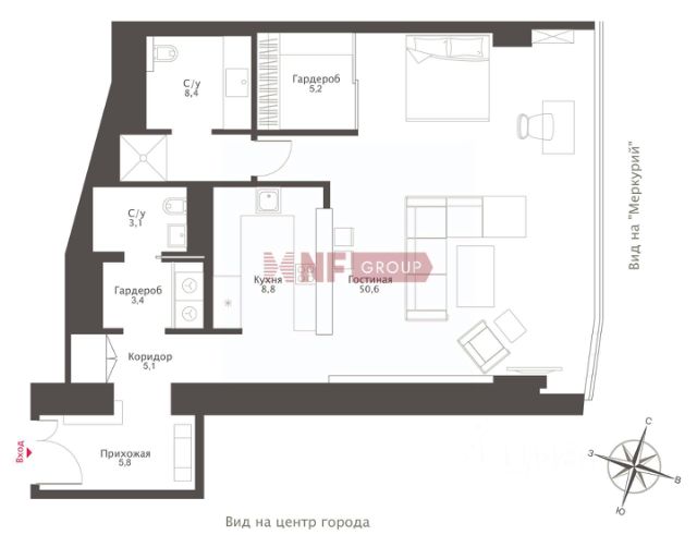 Планировкой пространство выглядит следующим образом: угловая гостиная совмещенная с кухней, мастер-спальня с панорамной ванной комнатой, холл, гостевой с/у, постирочная. Апартамент наполнен премиальной отделкой и мебелью: кухня RIFRA Италия, сантехника FANTINI Италия, бытовая техника KUPPERSBUSCH Германия, окна SCHUCO. Высота потолков 3м. Приточно-вытяжная система вентиляции и центральное кондиционирование для комфорта проживания.