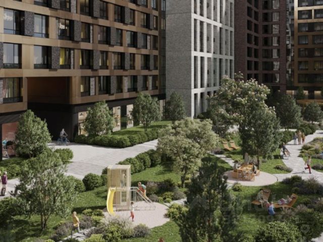 Ландшафтный дизайн внутри дворового пространства с локациями для работы и отдыха, детскими комплексами для разных возрастов.