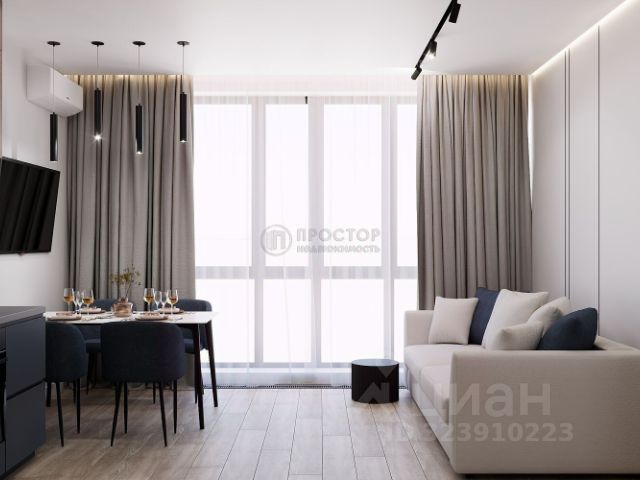 Квартира расположена на 10 этаже 32-этажного монолитного дома, не угловая, очень светлая, с панорамным остеклением и открывающимся видом на благоустроенную территорию комплекса.Ремонт из дорогих материалов, кухонный гарнитур, полы( ламинат), совместный С/У, меется гардеробная комната,шкаф-купе,частично меблированная.