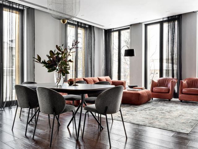 В квартире выполнена премиальная дизайнерская отделка с использованием высококачественных и натуральных материалов, таких как: натуральный мрамор, анодированная бронза, натуральный итальянский шпон, анодированная латунь.