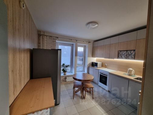 Большая кухня с островом, столешницей из кварцевого агломерата, большим двухкамерным холодильником, посудомоечной машиной 60 см и встроенной индукционной плитой на четыре конфорки. Духовой шкаф и микроволновая печь встроены в пенал. Верхних шкафов нет, что даёт пространству воздух и не утяжеляет его. Фартук выложен во всю стену до потолка мозаикой. Всё хранение помещается в нижних ящиках, пеналах и острове. Места много, поэтому в антресольных шкафах и в одном из пеналов можно хранить личные вещи. Есть винный шкаф. Механизмы Blum, мебель Стильные кухни, техника Bosch и Maunfeld, каменная раковина и кран Omoikiri. Фасады: светлые — МДФ в эмали, тёмные — МДФ под дерево. Мощный кондиционер Hisense, который засчитан на это большое помещение.