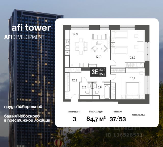 3-комнатная квартира площадью 84,2 кв.м., расположенная на 16 этаже 53-этажного небоскреба бизнес-класса это именно то, что вы ищете! AFI Tower — это не просто жилой комплекс. Это место, где каждая деталь заботливо продумана, чтобы сделать вашу жизнь удивительной и комфортной. Транспортная доступность - AFI Tower расположен близко к проезду Серебрякова, что обеспечивает быстрый доступ к Третьему Транспортному Кольцу и МКАД. За 15 минут можно легко добраться до ключевых транспортных магистралей в зависимости от дорожной ситуации. - В пешей доступности находятся станции метро "Свиблово" и "Ботанический сад" — это дает возможность жителям легко перемещаться по городу. Рядом также расположена станция Московского центрального кольца у "Ботанического сада". Архитектура: - Башня AFI Tower привлекает своим смелым архитектурным решением. Фасад, выполненный в виде мягкой волны, делает здание узнаваемым и уникальным в контексте стандартных высоток. С высотой в 182,4 метра, она становится неповторимой доминантой в Свиблово. Внутренняя инфраструктура: - Лобби AFI Tower выделяется современным дизайном, высокими потолками от 2,9 м до 3,3 м и использованием качественных материалов. Это визитная карточка здания, предоставляющая посетителям первое впечатление. Внутреннее пространство продумано для комфорта и функциональности. Характеристики квартир: - Здесь каждая квартира — уникальная история. От 19 до 116 м² площади, три варианта отделки — светлый, темный или white box, чтобы ваш дом отражал ваш вкус и стиль. Принимайте решение не просто о покупке жилья, а о создании своего собственного уютного уголка. Удобства внутри AFI Tower: - В самом доме целый мир удобств и развлечений. Ресторан, библиотека, прачечная и коворкинг — каждое место наполнено энергией и возможностями. Вечерами, уютная кинозона с кинопроектором и настольными играми создает атмосферу веселья и отдыха. Экология и окружение: - Жить в AFI Tower — значит быть частью уникального окружения. Близость к пруду и зеленому скверу придает местности неописуемое очарование. Вид из окон на Москву, ВДНХ и парки создают вдохновляющий пейзаж. А безопасность и удобство парковки добавляют приятные моменты к вашему образу жизни.
