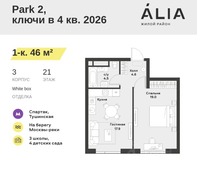 Продаётся 2-комнатная квартира 54 м². В жилом районе ALIA на 23-м этаже 30-этажного дома. Жилой район ALIA — это дома бизнес-класса у слияния Москвы-реки и Сходни. ALIA находится в Покровском-Стрешневе, экологически чистом районе на престижном северо-западе столицы. Район возводится на бывшей территории Тушинского аэрополя, где никогда не было промышленного производства. ALIA — это район разностороннего развития, спроектированный по принципу WORK.LIVE.PLAY.LEARN. Это "15-минутный город", где вся необходимая для комфортной жизни инфраструктура — на расстоянии приятной прогулки. У района удобное расположение: отсюда меньше 10 минут пешком до станций метро "Спартак" и "Тушинская" и всего полчаса на автомобиле до центра города или аэропорта Шереметьево. Архитектурную концепцию ALIA разработало бюро SOM (Skidmore, Owings & Merrill), авторы знаменитой "Бурдж-Халифа". В ALIA больше 140 планировочных решений, среди которых — редкие для Москвы форматы: квартиры с окном в ванной, пентхаус, сити-юниты и таунхаусы. Почти половина территории района отдана под благоустройство. В ALIA три парка: Линейный парк с кафе и магазинами, Центральный парк с амфитеатром, сухим фонтаном и большим плейхабом для детей всех возрастов и Прибрежный парк на собственной набережной, одной из самых длинных в Москве. В каждом урбан-блоке — закрытый внутренний двор с гипоаллергенными растениями и детской площадкой. В лобби каждого жилого корпуса в ALIA оборудована зона ожидания, колясочная, гостевой санузел и лапомойка для домашних животных. За стойкой ресепшена резидентов и их гостей встречает консьерж. Центральное лобби урбан-блока — это стильное общественное пространство с коворкингом, лаундж-зоной и кофе-пойнтом. Это "вторая гостиная" жителей урбан-блока и одно из мест, где формируется комьюнити ALIA. Два ключевых объекта инфраструктуры в ALIA — это спорткомплекс "Чкалов Арена", где представлены 25 видов спорта, и самый большой в стране бизнес-парк класса A, благодаря которому району обеспечено быстрое развитие.